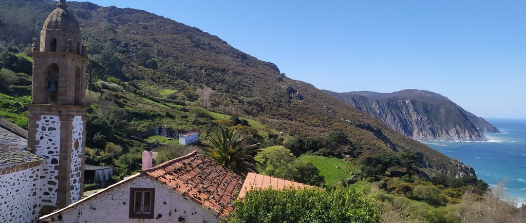 El santuario de San Andrés, encaramado sobre los acantilados de la Serra da Capelada, es el segundo centro de peregrinación de Galicia después de Santiago. El camino hasta allí, a través de la niebla atlántica y los prados verdes, tiene una magia que no se parece a ninguna otra ruta.